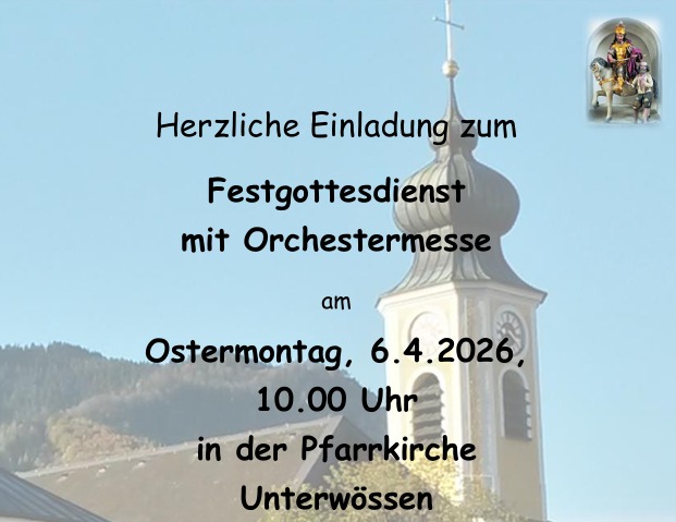 Herzliche Einladung zum Festgottesdienst mit Orchestermesse. „Missa brevis in G“ von W.A. Mozart. Musikalische Begleitung: Kirchenchor und Kirchenorchester St. Martin Unterwössen .