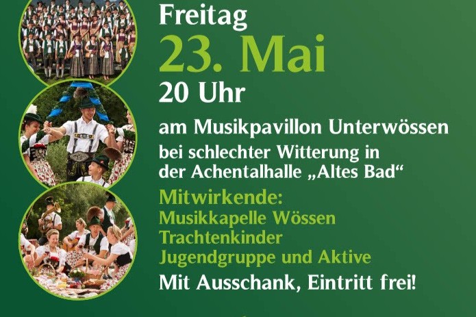 Am Musikpavillon, bei Regen findet die Veranstaltung im Alten Bad statt. Mitwirkende: Musikkapelle Wössen, Trachtenkinder, Jugendgruppe und Aktive. Mit Ausschank, Eintritt frei!